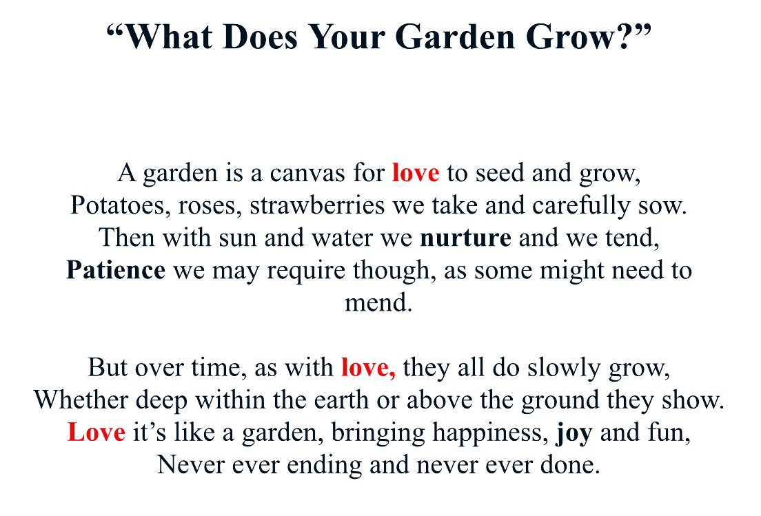 On Sunday 28th June, Rev Calder introduced the 'Fruits of the Spirit', the first being love. The week's challenges were all about love. Members of the Junior Church and congregation were invited to design a love heart or create some love word art. They were also asked to write a poem using 'How Does Your Garden Grow?', 'Fruits of the Spirit' or 'Love' as inspiration. As the gallery shows, we had lots of beautiful and creative entries.
