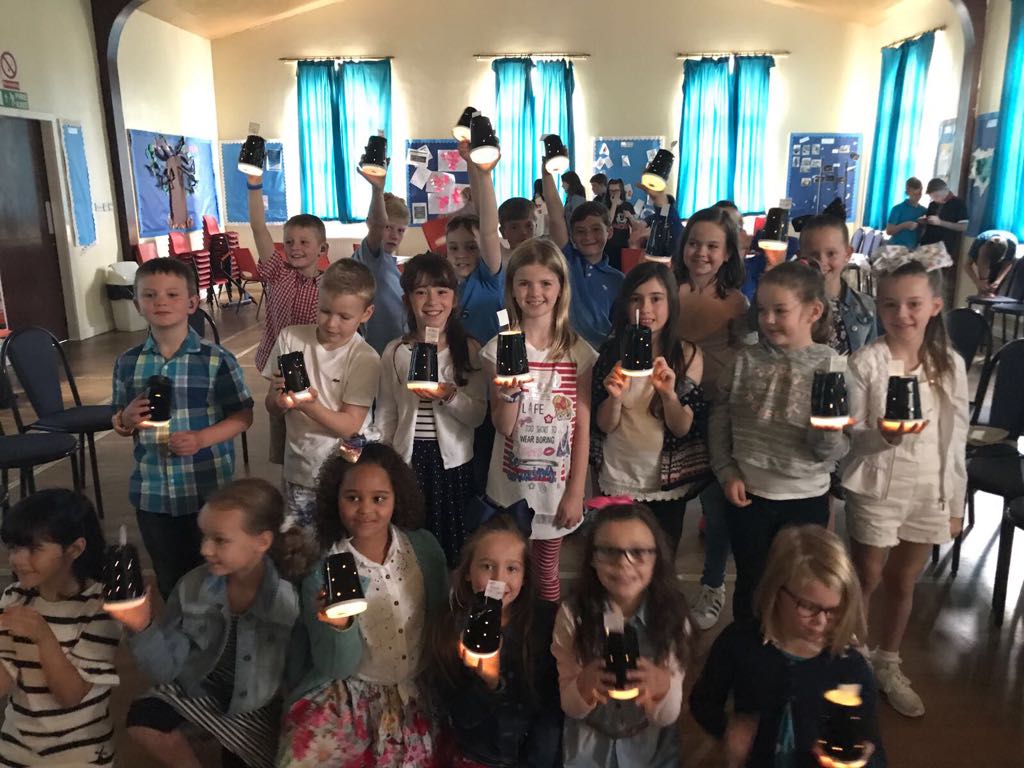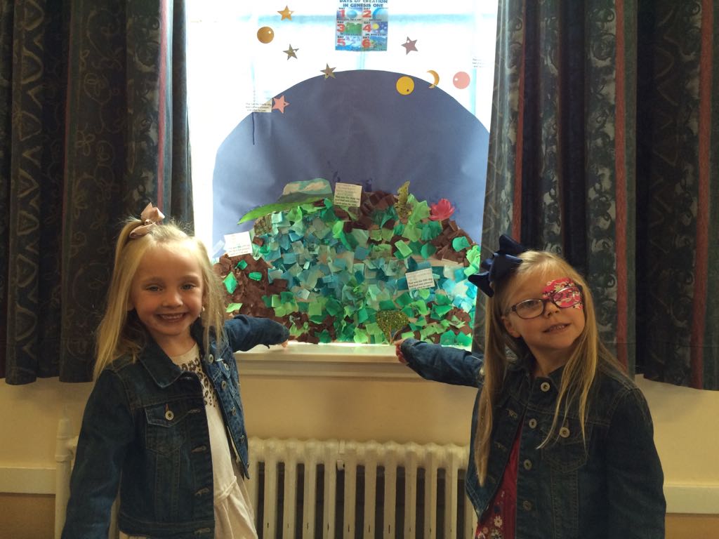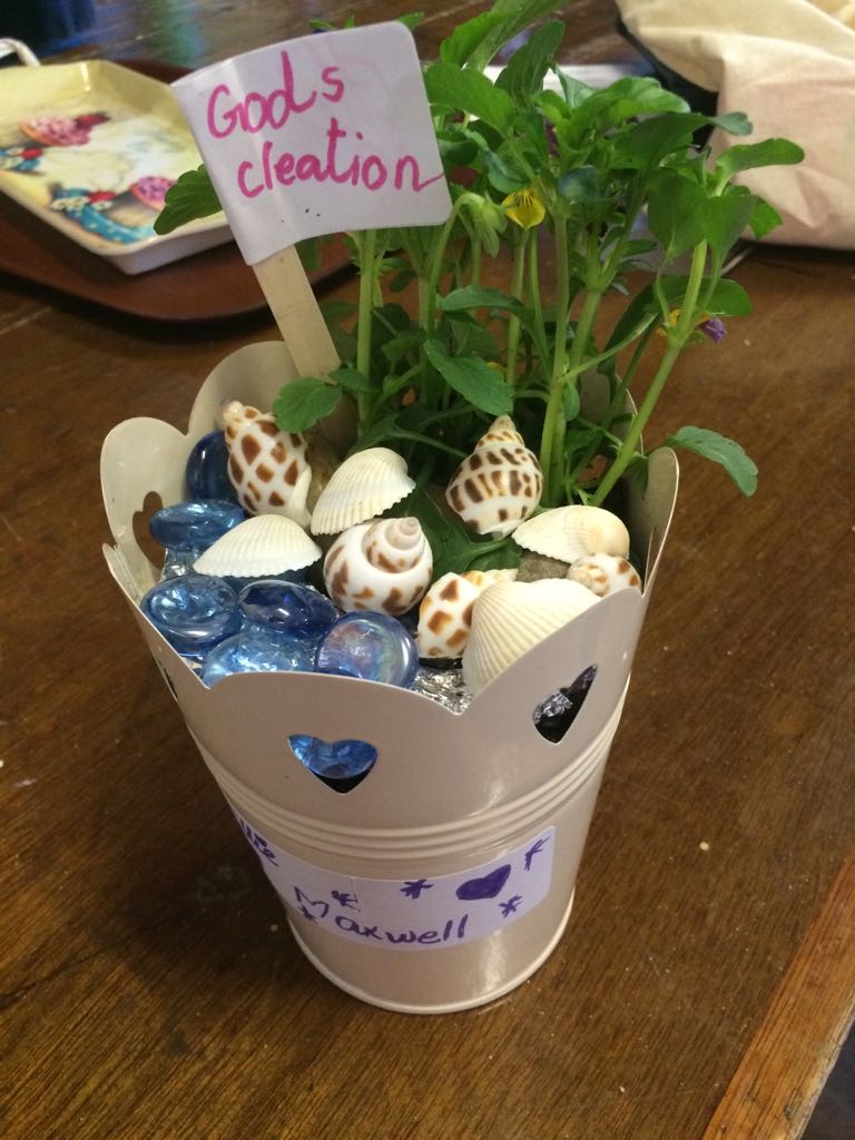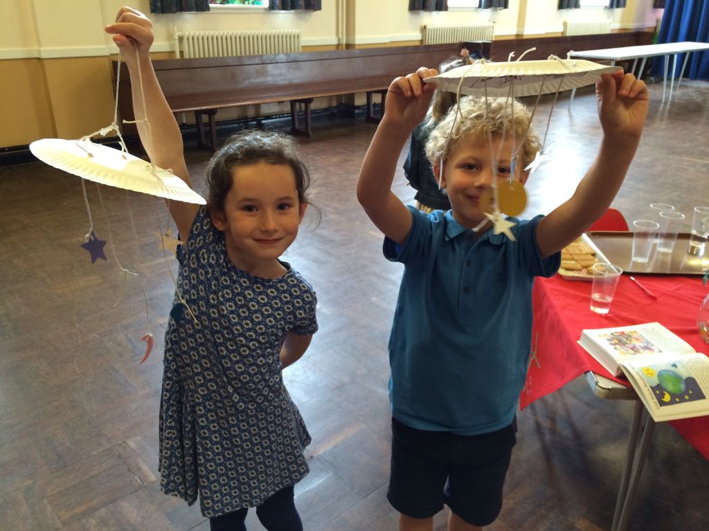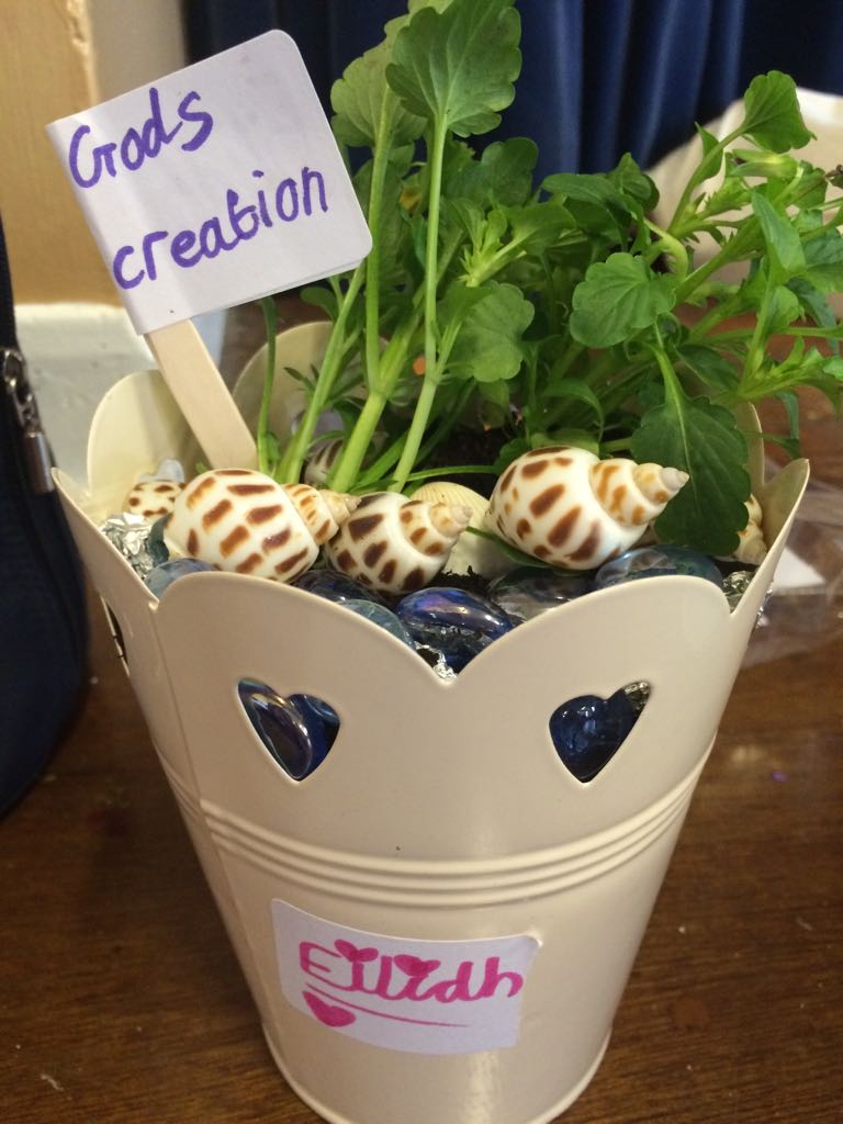 During our first four weeks, we will be looking at the creation story. Our crafts have been on display in the halls including a creation frieze and our sun, moon and stars mobiles. The children from our Kids Zone were happy to take home their light boxes and the land and sea plant pots.