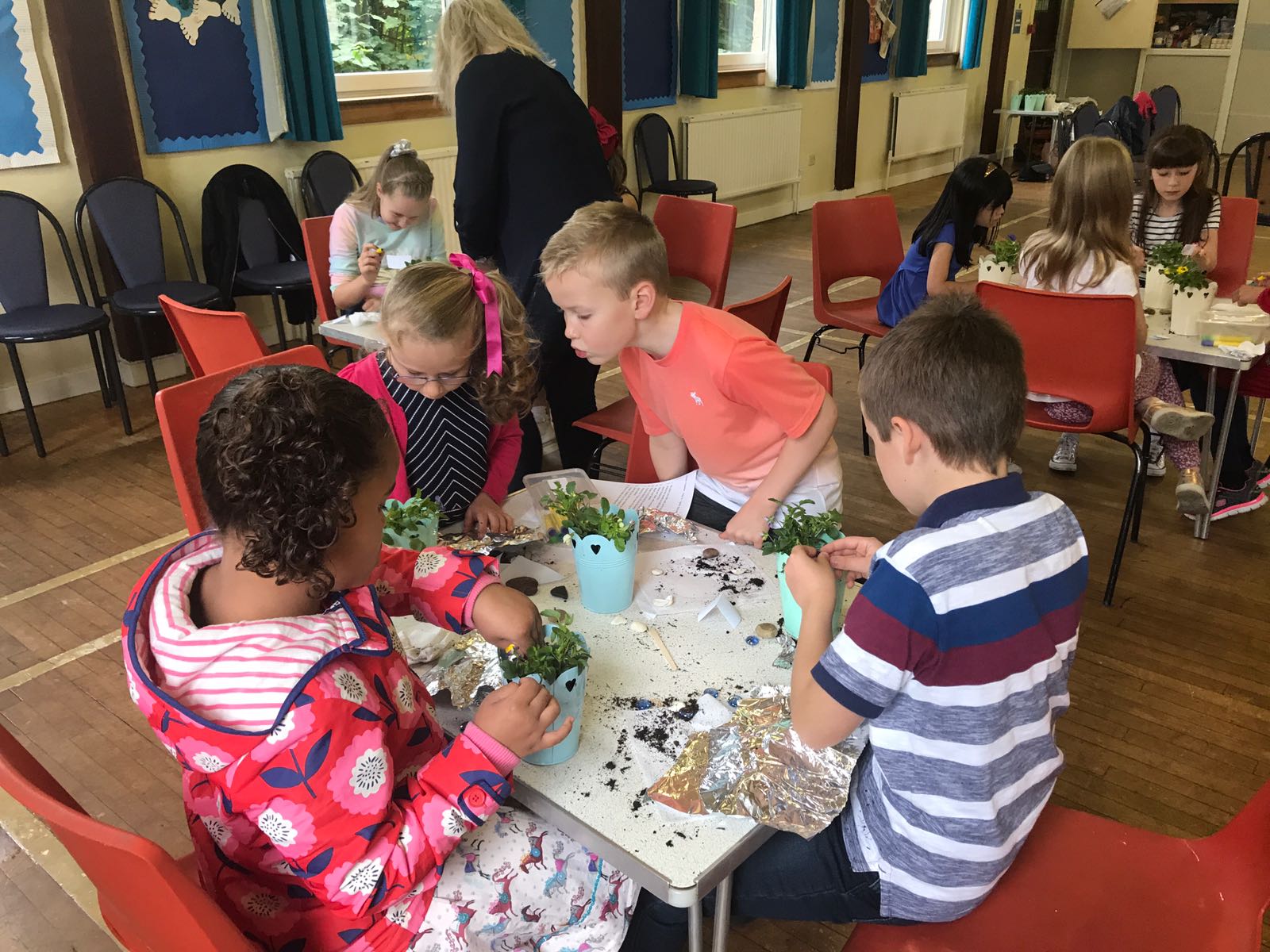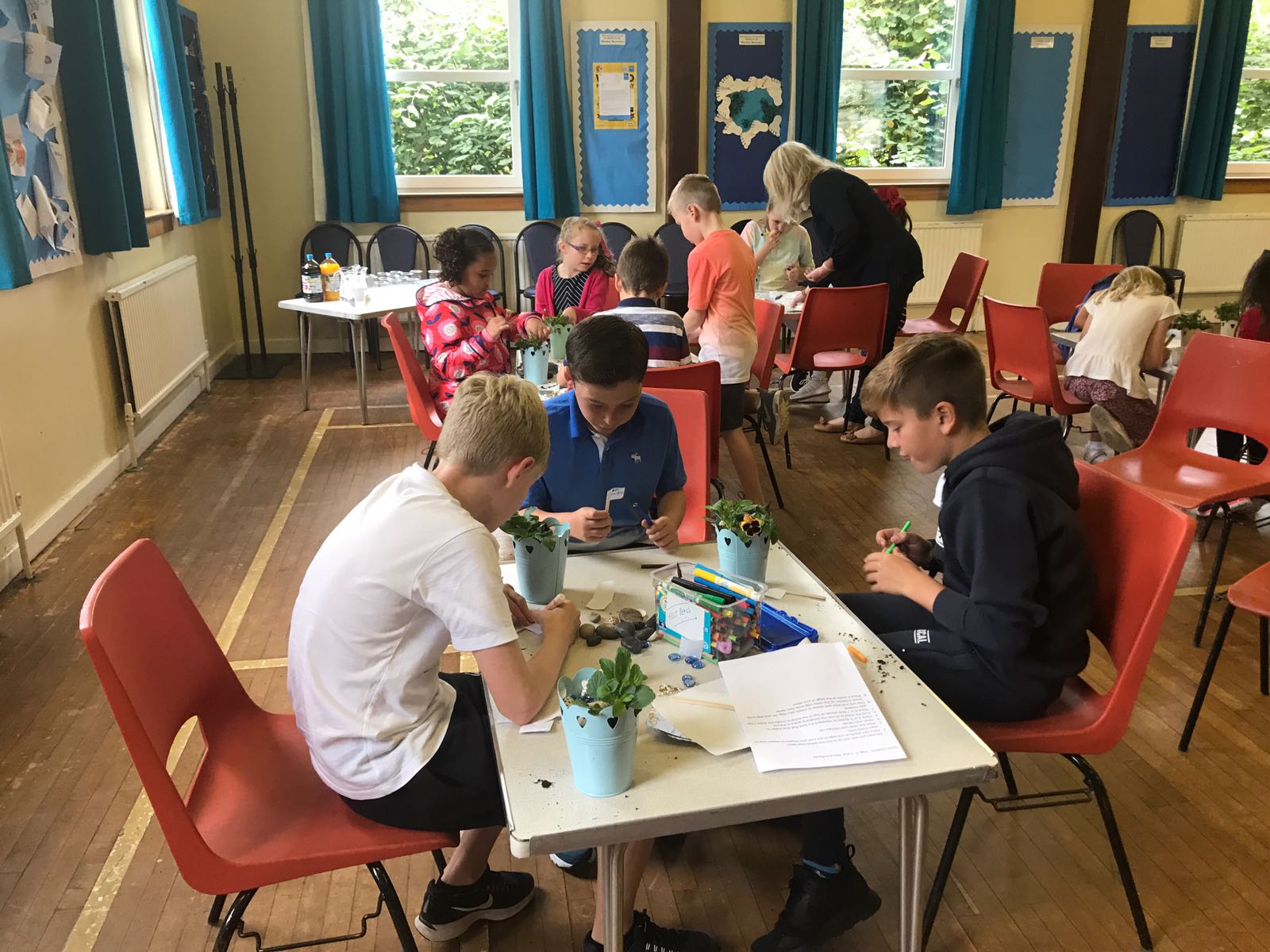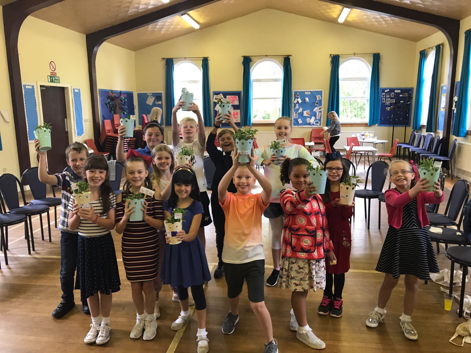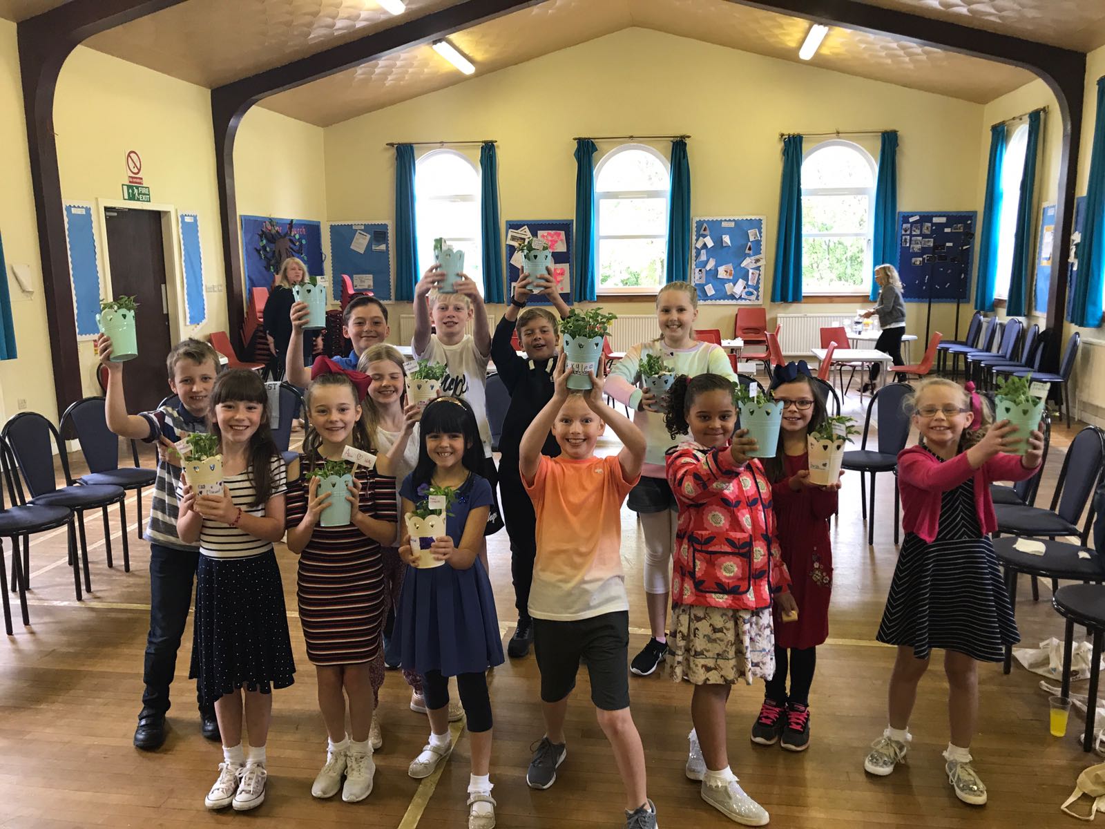 During our first four weeks, we will be looking at the creation story. Our crafts have been on display in the halls including a creation frieze and our sun, moon and stars mobiles. The children from our Kids Zone were happy to take home their light boxes and the land and sea plant pots.